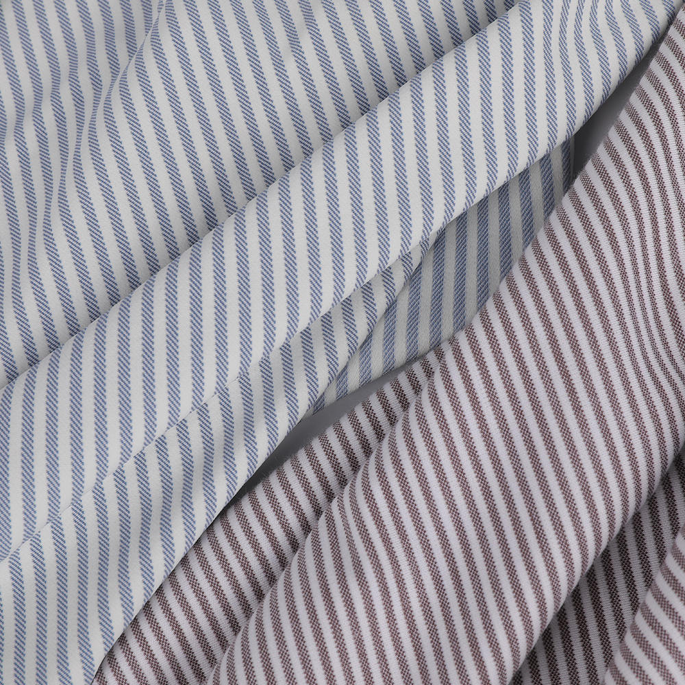 Ullmjuka och hudvänliga randiga skjorta tyg antar precisionsvävteknik och innehåller en randig mönsterdesign som är både klassisk och fashionabla. Det randiga mönstret visar en lågmäld och avancerad visuell skönhet genom subtila färgförändringar, som inte bara ger en känsla av visuell skiktning utan också förbättrar skjortans stil och smak. Den randiga designen har en visuell stretcheffekt, som hjälper till att forma en smal och upprätt figur. När det gäller komfort har detta tyg genomgått flera mjukningsprocesser för att effektivt ta bort klåda av ull och behålla sina varma och lätta egenskaper. Det speciellt behandlade ulltyget kan ge en bekväm och naturlig bärupplevelse när det kommer i direktkontakt med huden, vilket är lämpligt för människor med känslig hud och de som bedriver en högkvalitativ bärupplevelse.