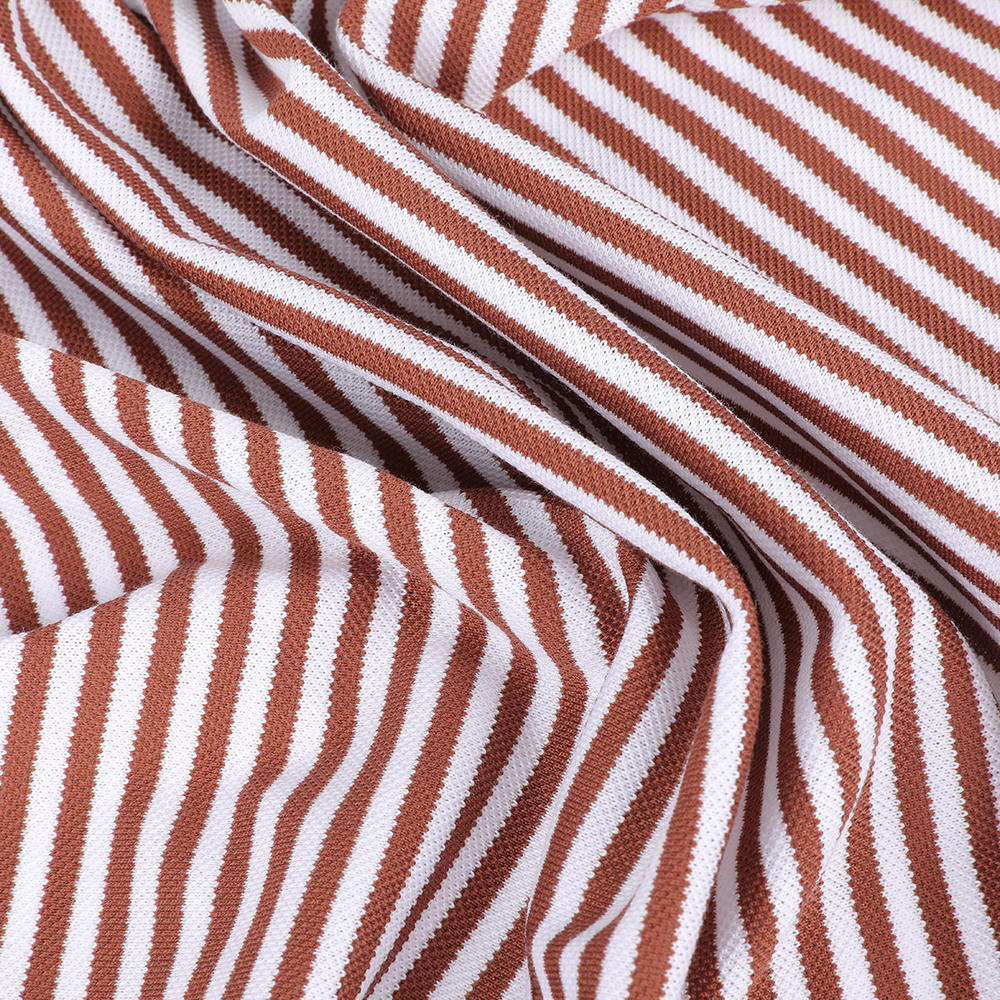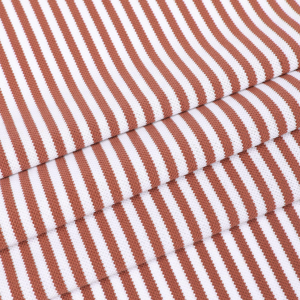 Bekväm andningsbar Pique Mesh Cotton La randig flytande ammoniakstyg som är lämpligt för polo i kombination med avancerad flytande ammoniakbehandlingsteknik, syftar det till att ge användarna en professionell komfort och hållbarhet. Pearl Mesh Cotton bildar en nätstruktur med sin unika vävningsprocess, vilket effektivt förbättrar andningsbarheten och fuktabsorptionen av tyget. Även i miljöer med högt temperatur kan det effektivt ta bort svett, hålla huden torr och förbättra bärande komfort. Samtidigt har tyget god elasticitet och slitmotstånd, vilket säkerställer att kläderna förblir skarpa och snygga efter långvarig slitage och är inte lätt att deformera, möta användarens efterfrågan på klädhållbarhet. Tillämpningen av flytande ammoniakbehandlingsteknik förbättrar ytterligare kvaliteten på tyget. Genom att förbättra den molekylära strukturen hos bomullsfibrer gör flytande ammoniakbehandling tyget mjukare och mjukare, med en delikat touch, samtidigt som färgfasthet och rynka motstånd förbättras. Detta innebär att användare enkelt kan ta hand om kläderna utan att stryka efter tvätt, och kläderna är fortfarande ljusa och nya och sparar tid och energi. När det gäller design antar tyget klassiska randiga element, som är enkla generösa och enkla att matcha.